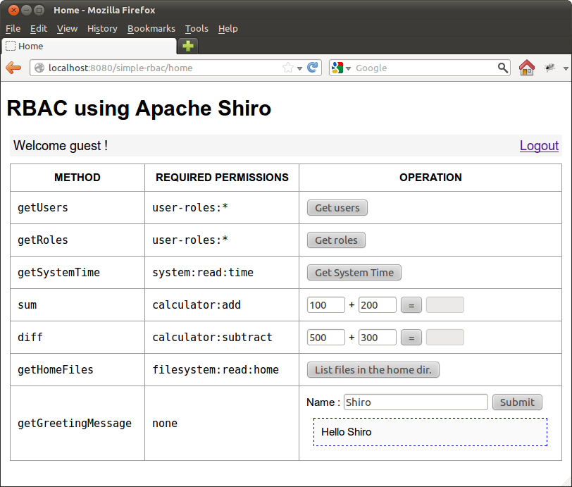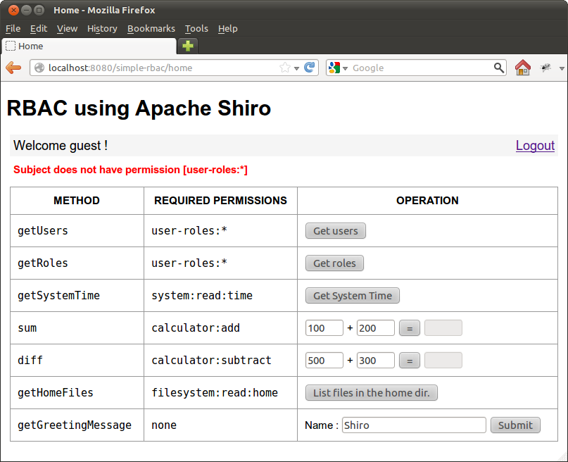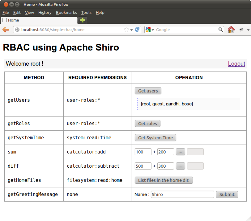 . Each one of them have different roles. The application provides a simple web-based user interface to access a protected service (some kind of facade). The users need special privileges to access each of the operation provided by the protected service. A screenshot of the application is shown below.
